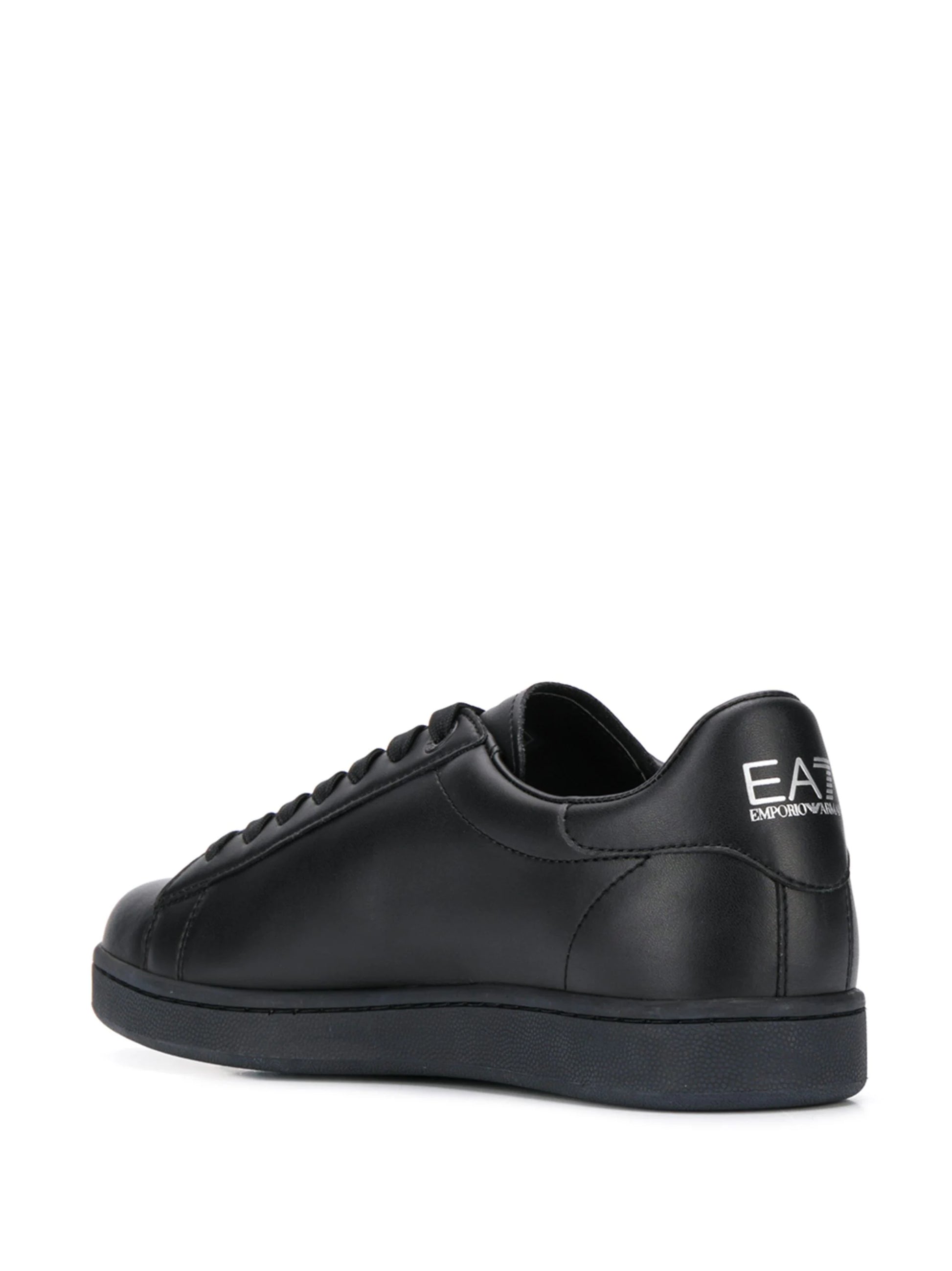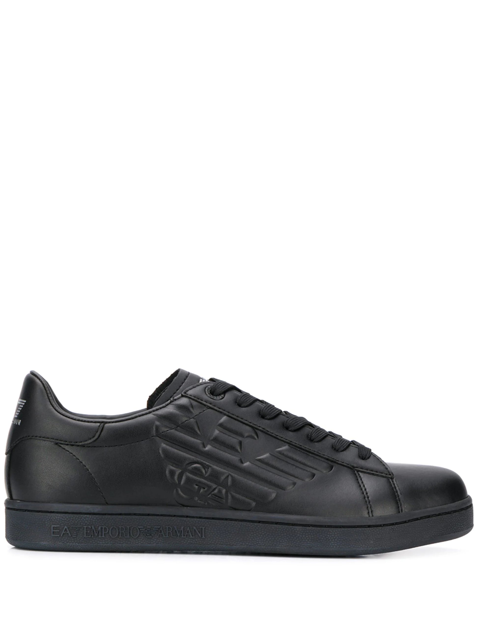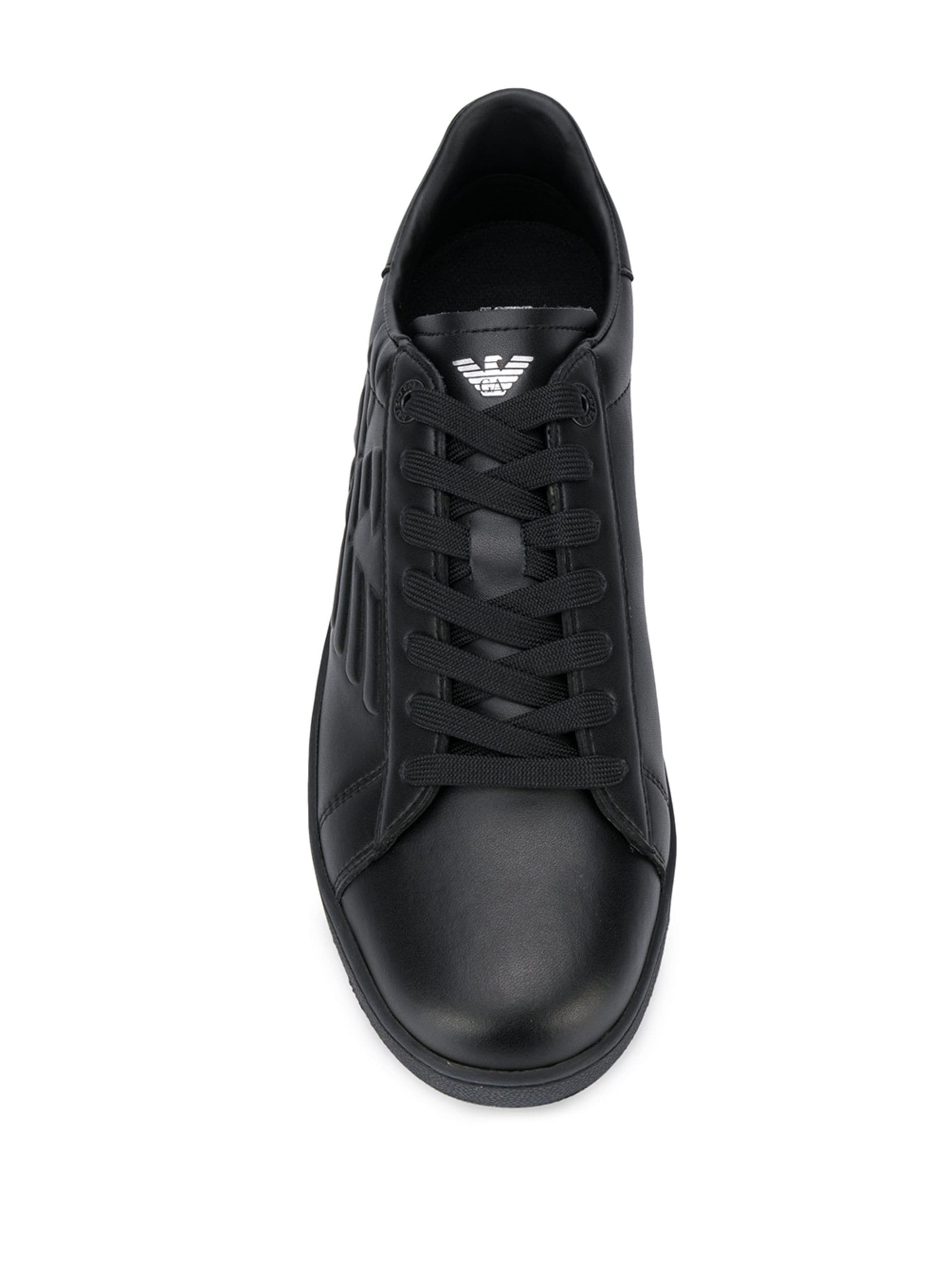 Sneakers con logo goffrato di colore nero in pelle di Ea7 Emporio Armani. Modello con punta tonda, chiusura con lacci, linguetta con logo goffrato, logo esterno, logo stampato sulla parte posteriore e suola piatta in gomma.
