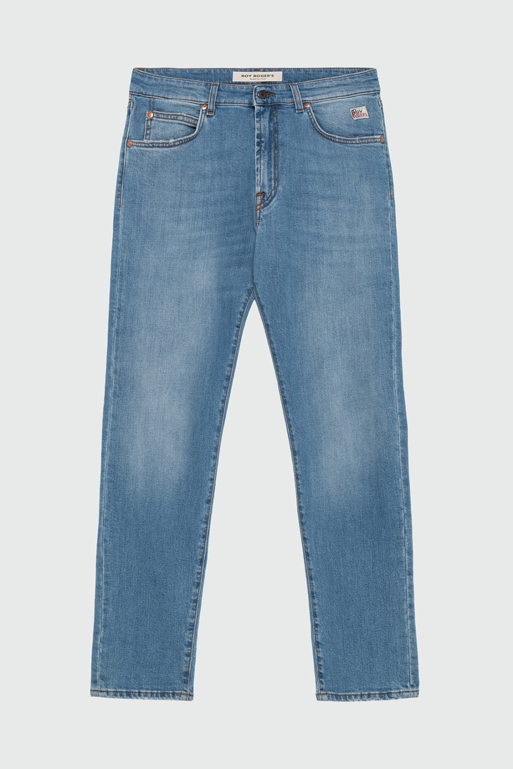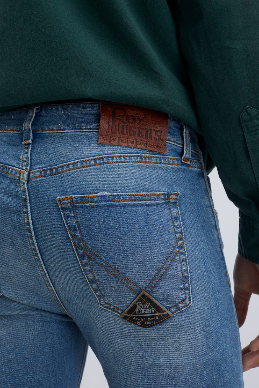 Jeans in denim con lavaggio chiaro. Vita media con passanti e salpa applicata sul retro. Chiusura con bottone logato e zip. Due tasche sul fronte e due tasche sul retro con label Roy Roger's applicata. Slim fit. COMPOSIZIONE: 87% COTONE 11% POLIESTERE 2% ELASTODIENE.
