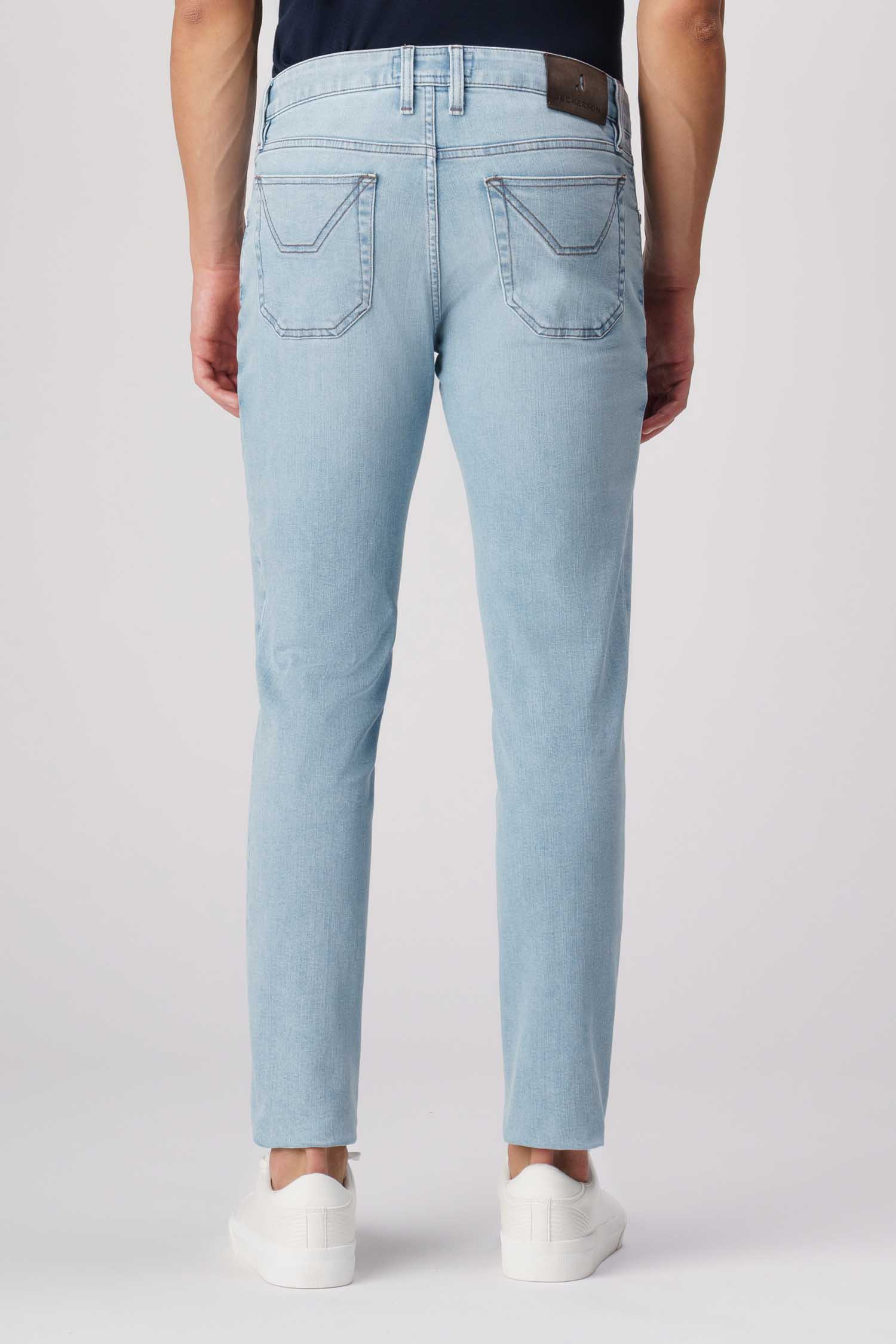 Pantalone 5 tasche skinny fit realizzato in comfort denim blu chiaro con toppa in alcantara in tono. Il modello è caratterizzato da cintura interna che riporta il nome e il fit del modello ricamati in tono con le cuciture e logo J ricamato sul taschino sinistro.